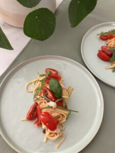- Kook de spaghetti en meng de warme spaghetti met het tomatenmengsel, de mozzarella, de rucola en basilicum