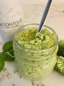 - De pesto hoort romig te zijn, voeg olijfolie toe als de pesto te droog is