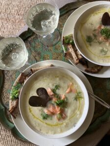 - Werk af met het venkelgroen, rivierkreeftjes/ gerookte zalm en een scheut Moontolio